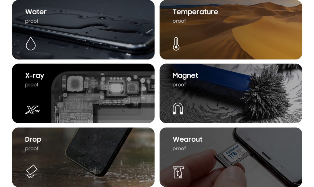 microSD EVO Plusは、防水¹、耐熱²、耐X線³、耐磁⁴、耐落下⁵、耐摩耗⁶ の6つの保護機能であなたの大切な思い出、データを守ります。Samsungでは、10年間の限定保証⁷ を提供しています。