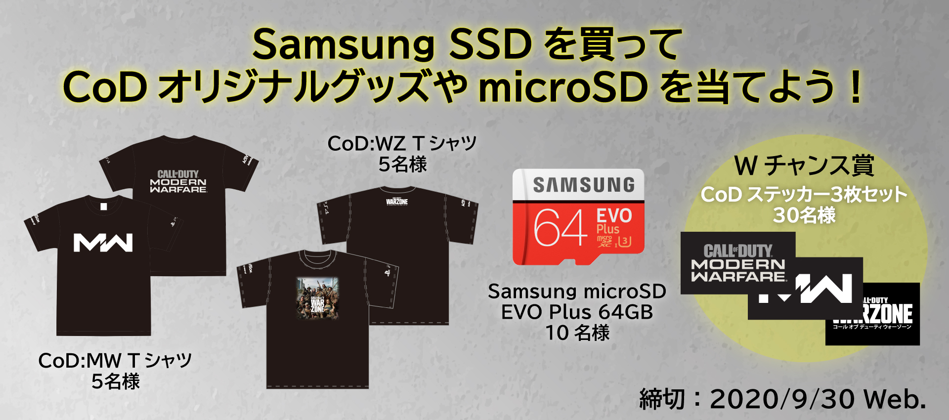 本イベントの配信を見て下記表のSamsung SSDを購入していただいた方の中から抽選で最大50名様にCoDオリジナルグッズやSamsung microSD EVO Plus(64GB)が